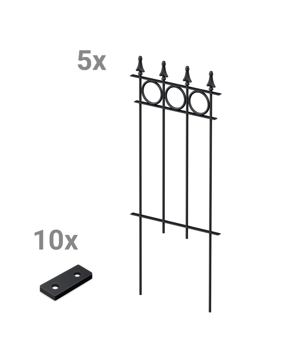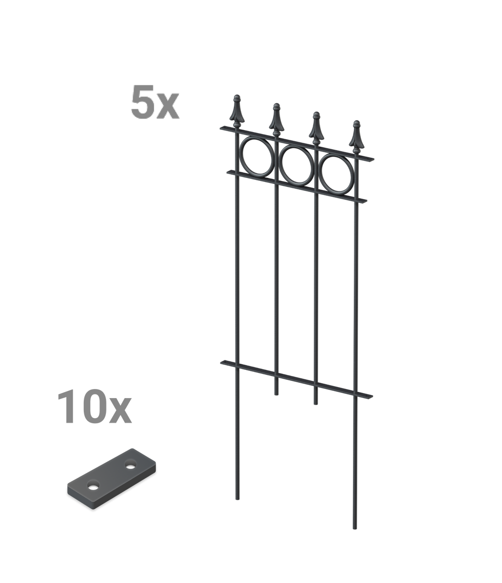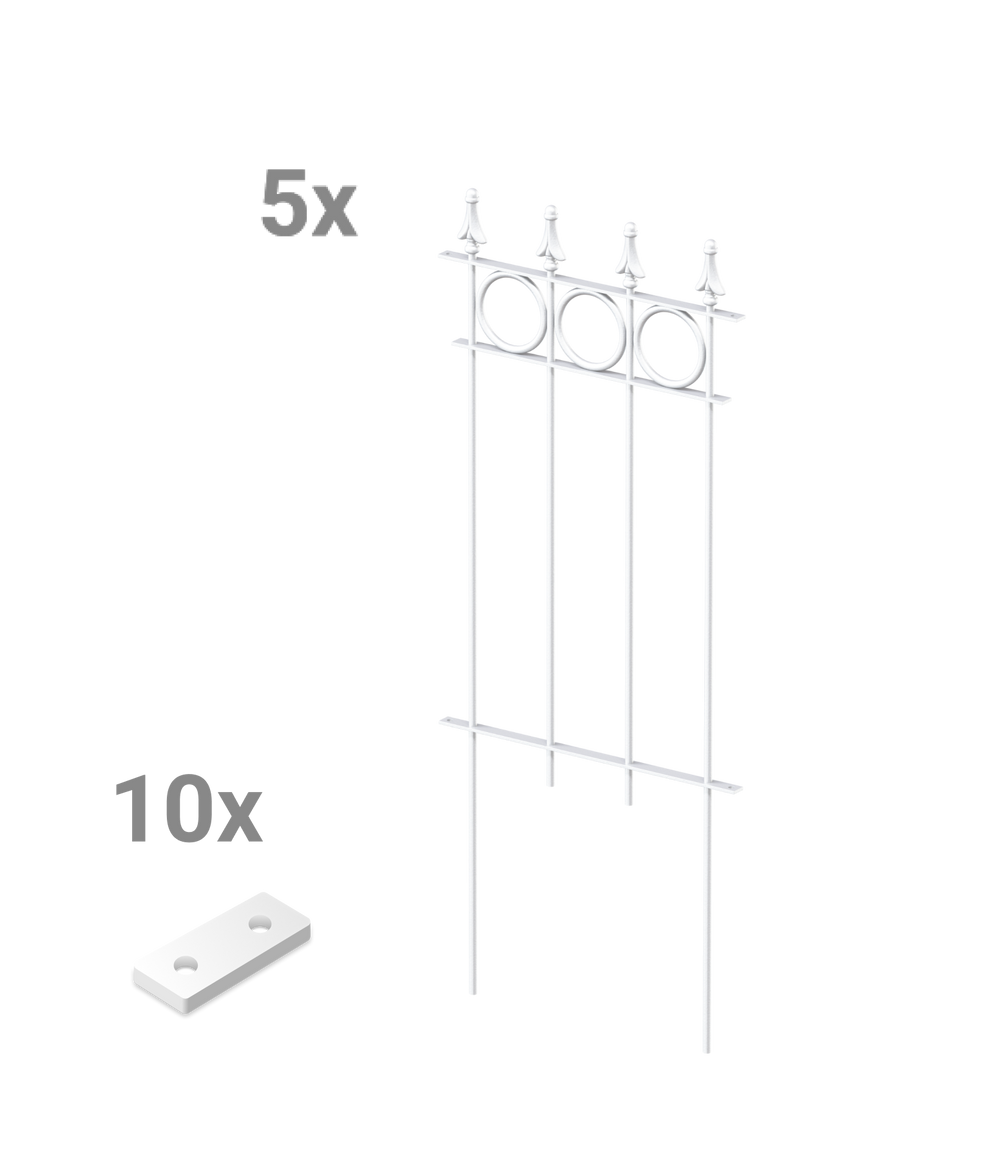 Our "Belluno" modular fence is available here in a convenient and practical complete set, consisting of five fence panels. "Belluno" features circular ornaments and an elegant pine-effect finial. Each panel measures 44.1 cm wide and 105 cm high, including the finial and ground anchors. The individual fence panels can be easily screwed together using a small connector. Choose your own coating and give your "Belluno" picket fence a personal touch!