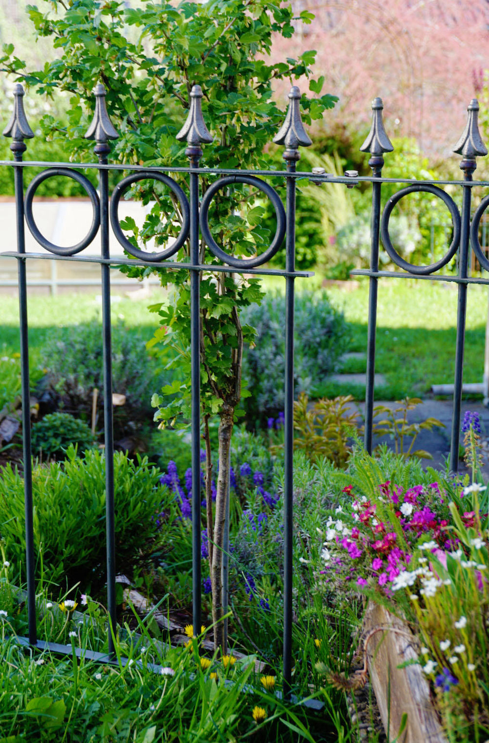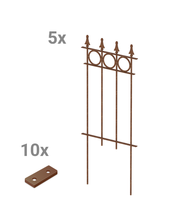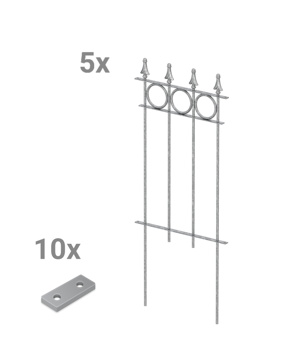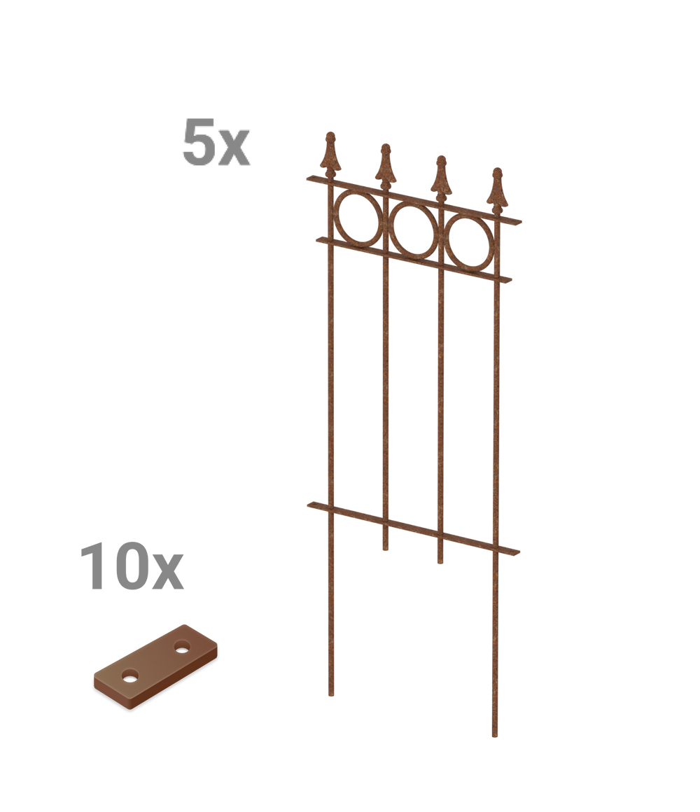 Our "Belluno" modular fence is available here in a convenient and practical complete set, consisting of five fence panels. "Belluno" features circular ornaments and an elegant pine-effect finial. Each panel measures 44.1 cm wide and 105 cm high, including the finial and ground anchors. The individual fence panels can be easily screwed together using a small connector. Choose your own coating and give your "Belluno" picket fence a personal touch!