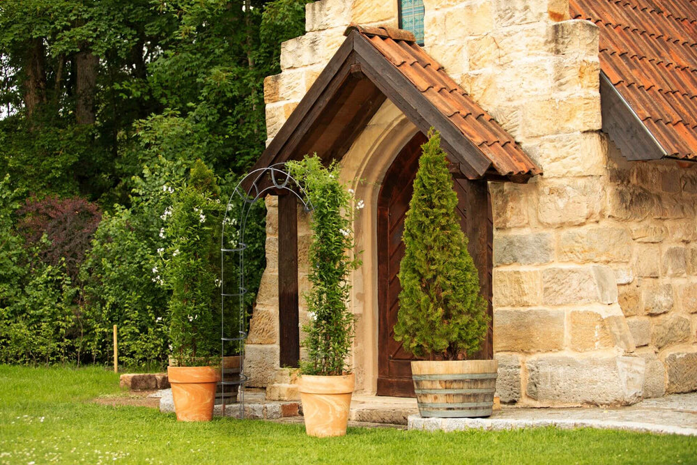 Our "Caserta" Garden arch is handcrafted from sturdy steel. It impresses with its exceptional design, consisting of a double arch structure and cylindrical columns. This construction offers climbing plants ample space to wind their way up the arch and completely cover it. Thanks to its striking shape, "Caserta" is not only particularly stable but also serves as a stylish focal point in the garden. With a height of 240 cm and a width of 156 cm, the Garden arch boasts a robust construction that withstands all weather conditions for years without losing its appearance or stability.