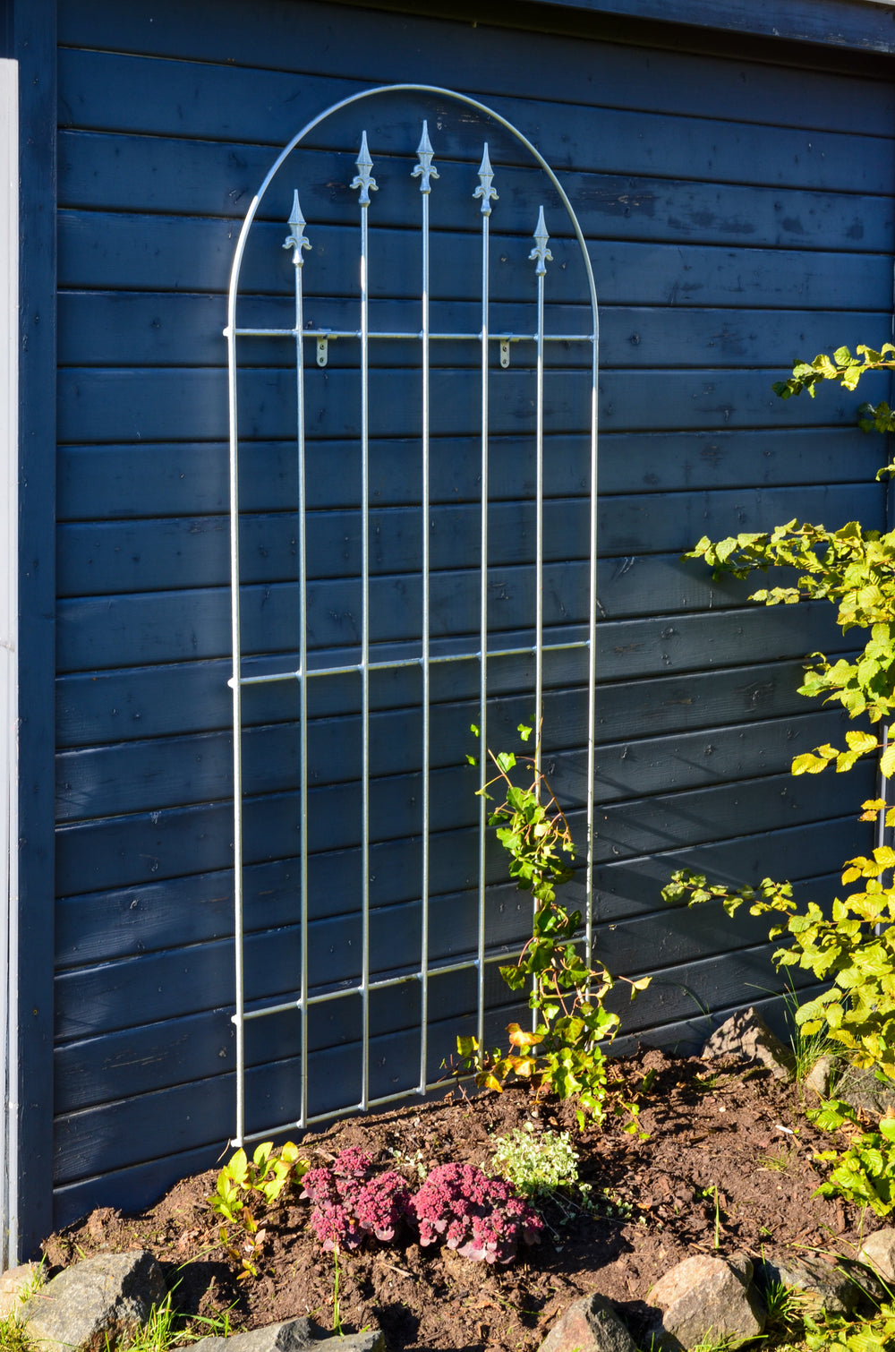 Elegant all around: Our "Edera" wall trellis impresses with its arched design and is a striking eye-catcher. Beautifully crafted, it features five nostalgic fleur-de-lis finials that lend the metal trellis a particularly sophisticated touch. The overall height is 168.5 cm, and the width is 79 cm.
