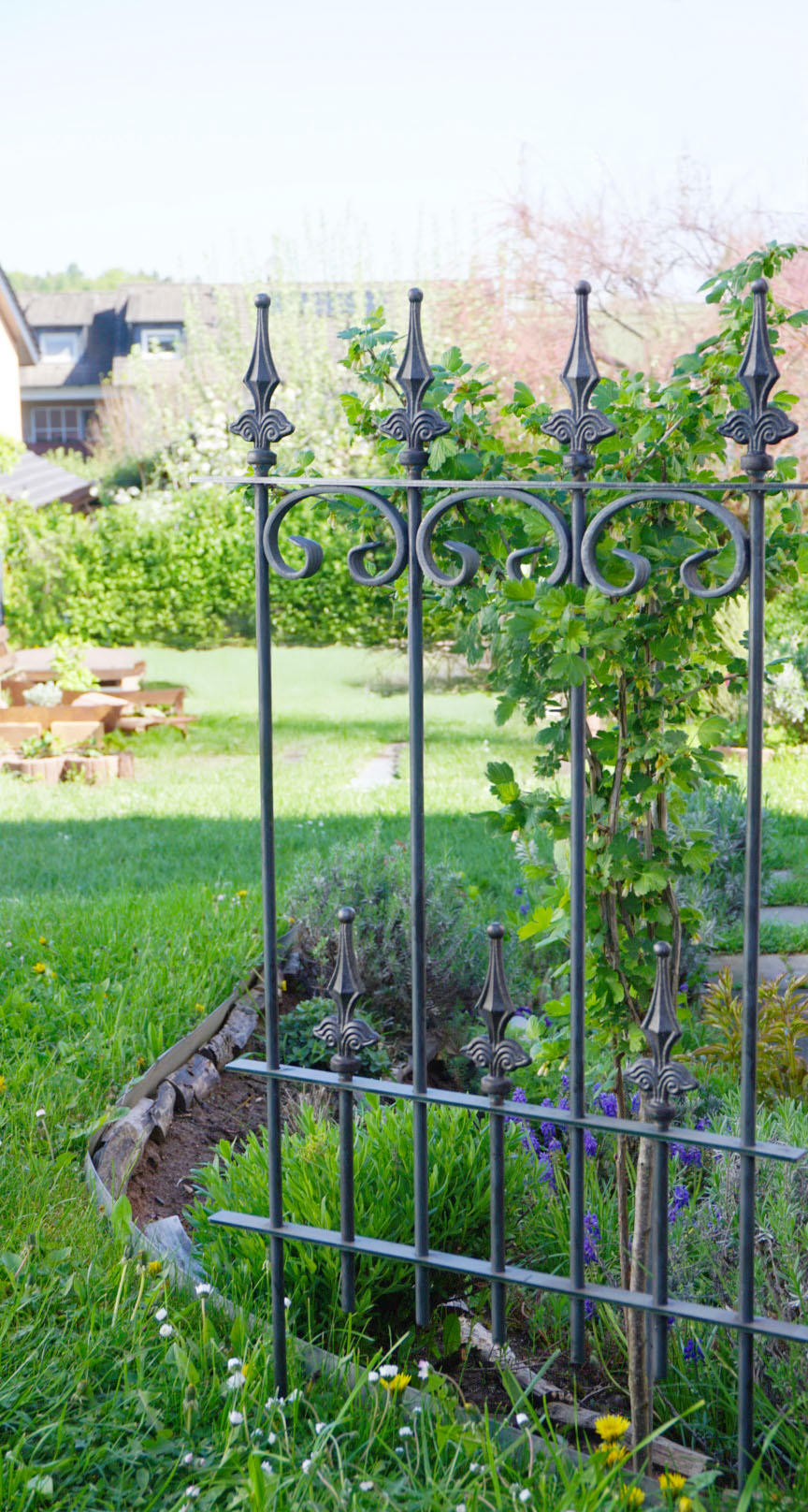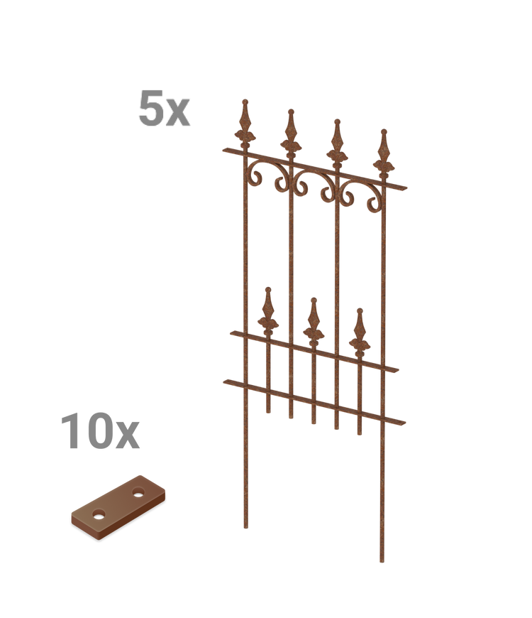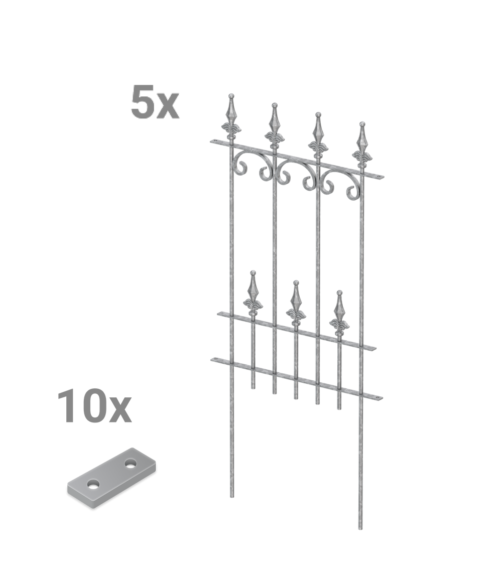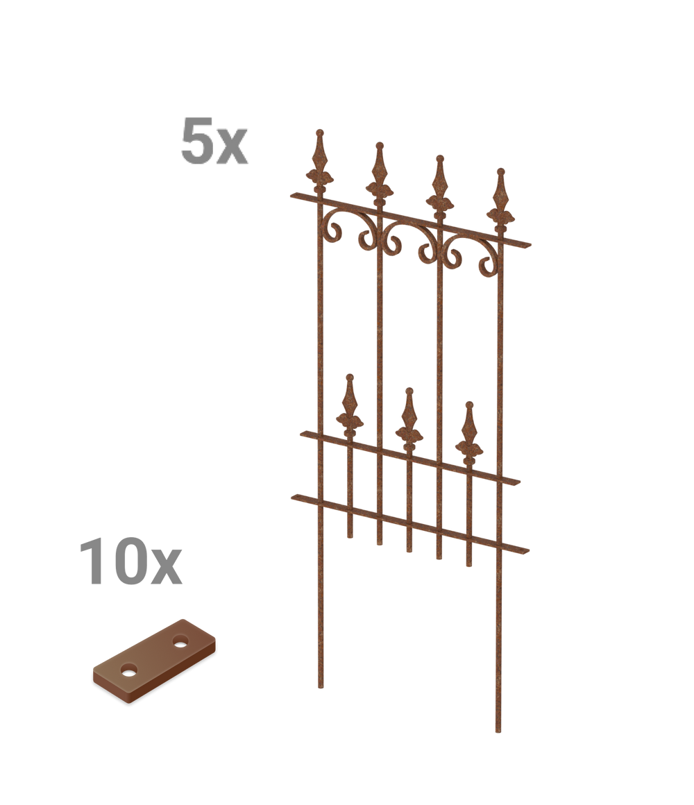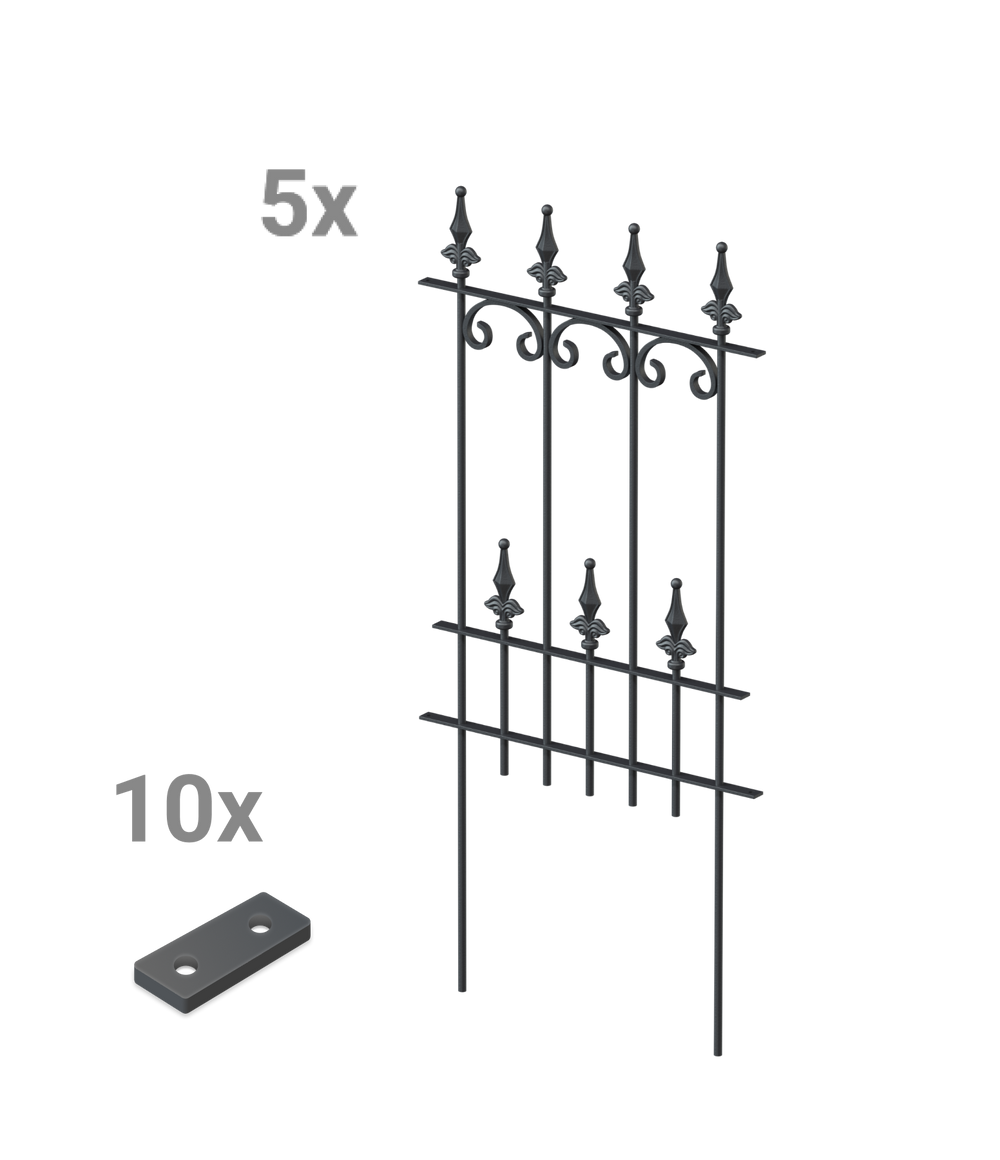 Our popular "Lucca" fence model, with its artistic C-shaped decorations and elegant "Ball Lilies" finial, is available here as a practical modular fence set. The set includes five high-quality metal fence panels, each measuring 50 cm wide and 105 cm high, including the finial and ground anchors. The "Lucca" modular fence panels can be quickly and easily inserted into the ground and simply screwed together using the included connectors. Create a decorative and functional garden border in no time!