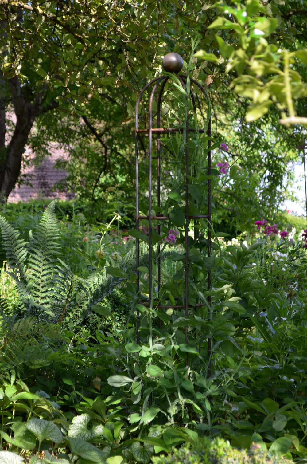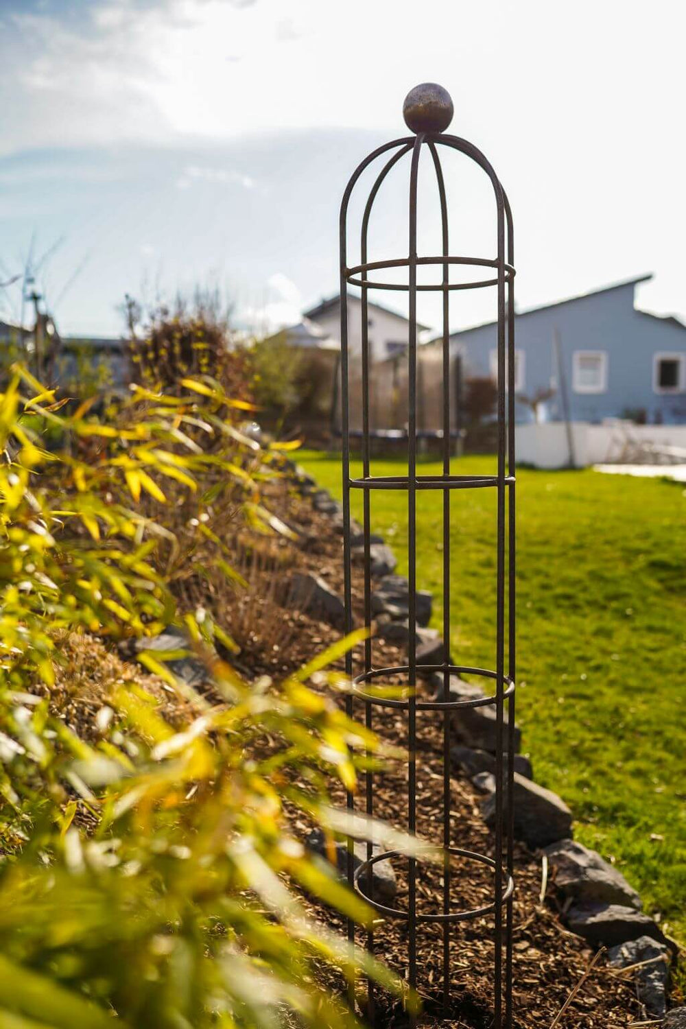 Pflanzstütze Arezzo in unbeschichtet als 3D-Modell Pflanzstütze Arezzo in pulverbeschichtet Anthrazit in einem bepflanzten Garten