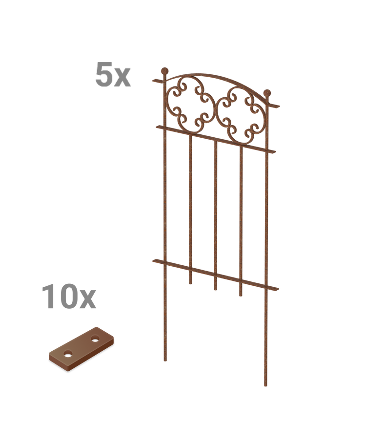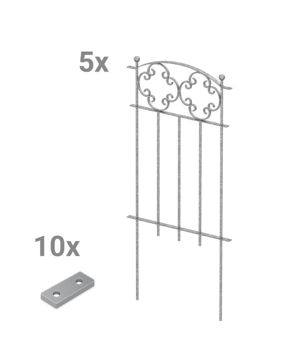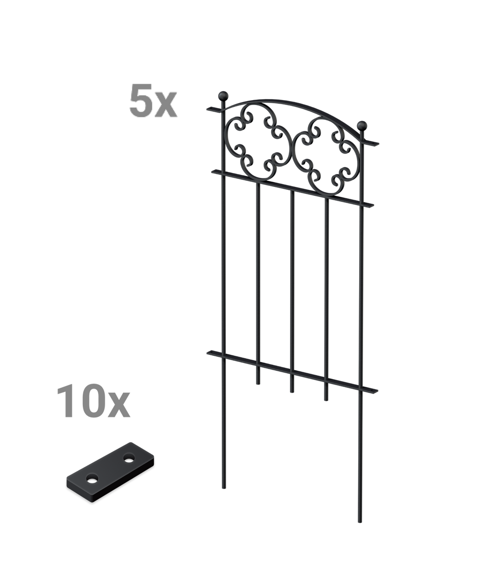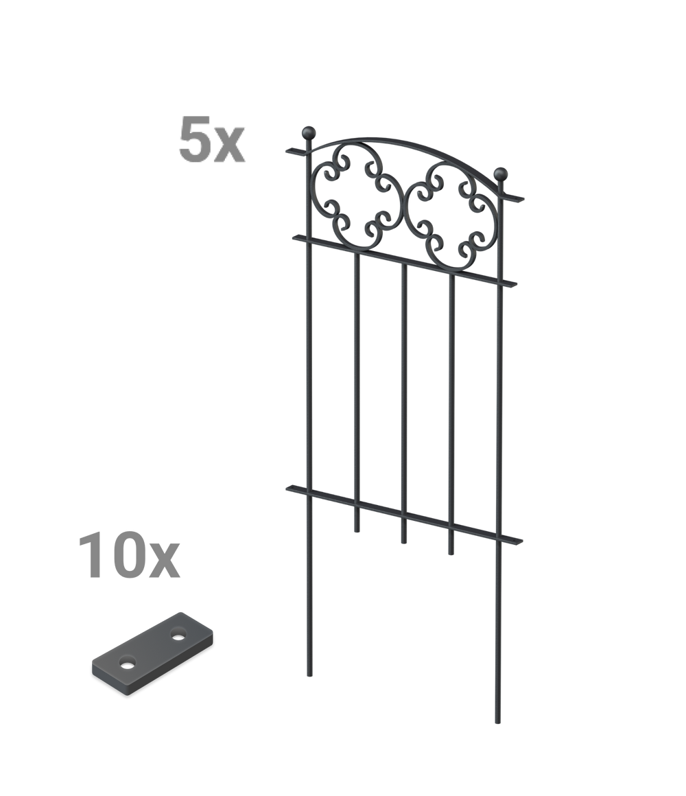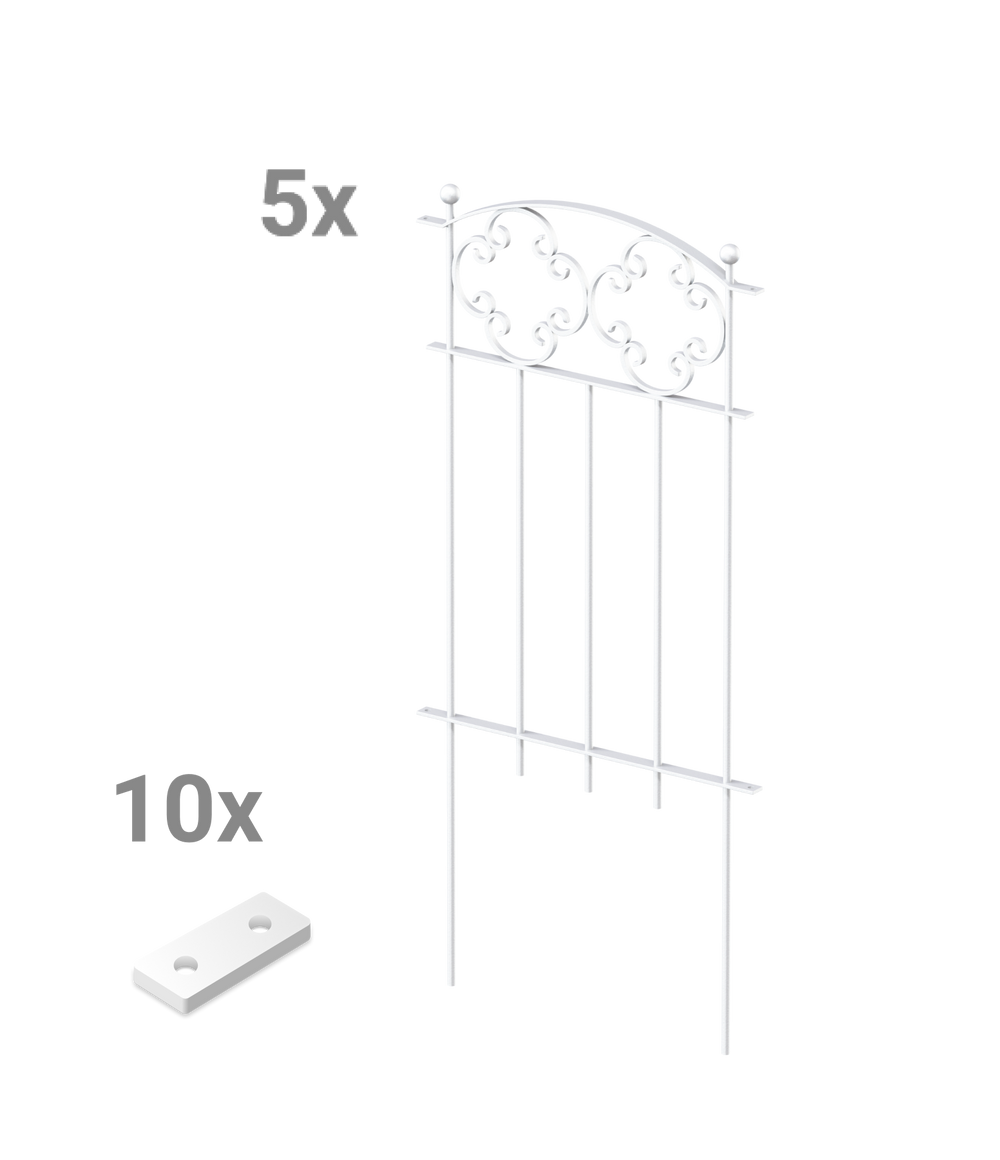 Our "Pink" picket fence with romantic C-shaped decorations that create a charming floral design is available here in a practical complete set. The set includes five fence panels, each 50 cm wide and 105 cm high – including ground anchors. Assembly is effortless: simply insert the fence panels into the ground and securely connect them using the included connecting plates and screws. You can even choose the finish yourself!
