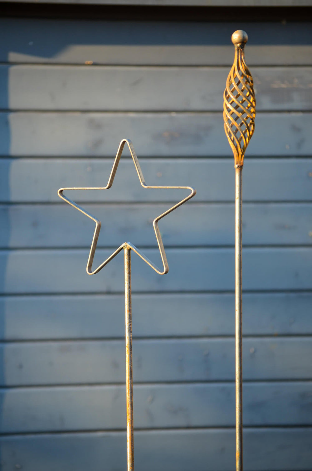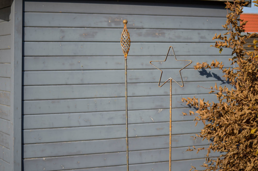 Star and spindle in a convenient set of two: These two handcrafted garden stakes will beautify your garden in a special way. "Tissano" is adorned with a star, while "Vicenza" culminates in an elaborate spindle finial. Two beautiful and high-quality metal garden stakes! Both models have a total height of 160 cm.